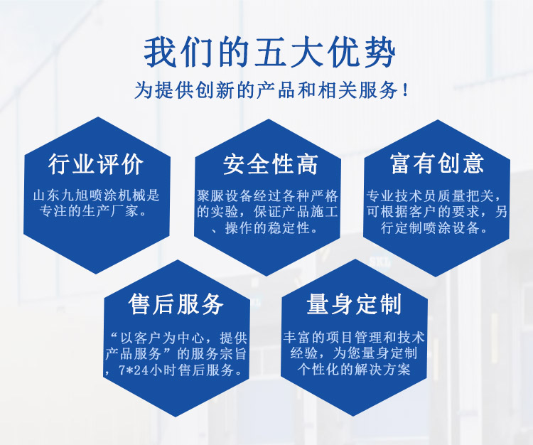 山東九旭機械科技有限公司是專業(yè)從事聚脲噴涂,聚脲噴涂設(shè)備,聚脲噴涂機,聚脲原料,聚脲防水涂料,聚脲設(shè)備產(chǎn)品配件的、生產(chǎn)、銷售和服務(wù)為一體的公司。歷經(jīng)十余年的發(fā)展,已成長為聚氨酯設(shè)備行業(yè)頗具實力的設(shè)備制造業(yè)之一...